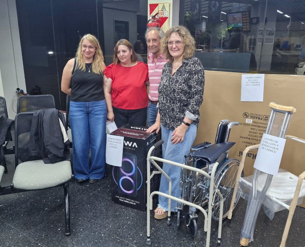 Por su parte, las instituciones que fueron beneficiadas con las donaciones de estos elementos fueron: Hospital Samco de Carmen, Escuela Primaria N° 165 «General Manuel Belgrano», Jardín de Infantes N° 172, Escuela de Educación Secundaria Orientada N° 8092, Biblioteca Popular «Domingo Faustino Sarmiento» y Centro de Jubilados y Pensionados.