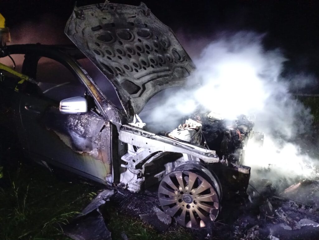 El segundo llamado se realizó a las 2:10 por el siniestro de un Mercedes Benz C300 color gris tripulado por Nicolás de 63 años de la localidad de Rosario que se encontraba totalmente prendido fuego en el Km. 627 de la ruta 33.
