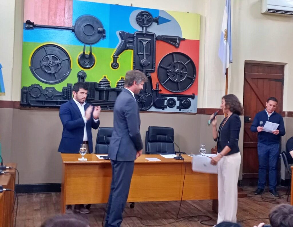 (PR/Norma Migueles) La senadora departamental Leticia Di Gregorio tomó el juramento de la nueva Constitución de la Provincia de Santa Fe al intendente de Venado Tuerto, Leonel Chiarella, y al presidente del Concejo Municipal, Santiago Meardi, en el recinto del legislativo local.