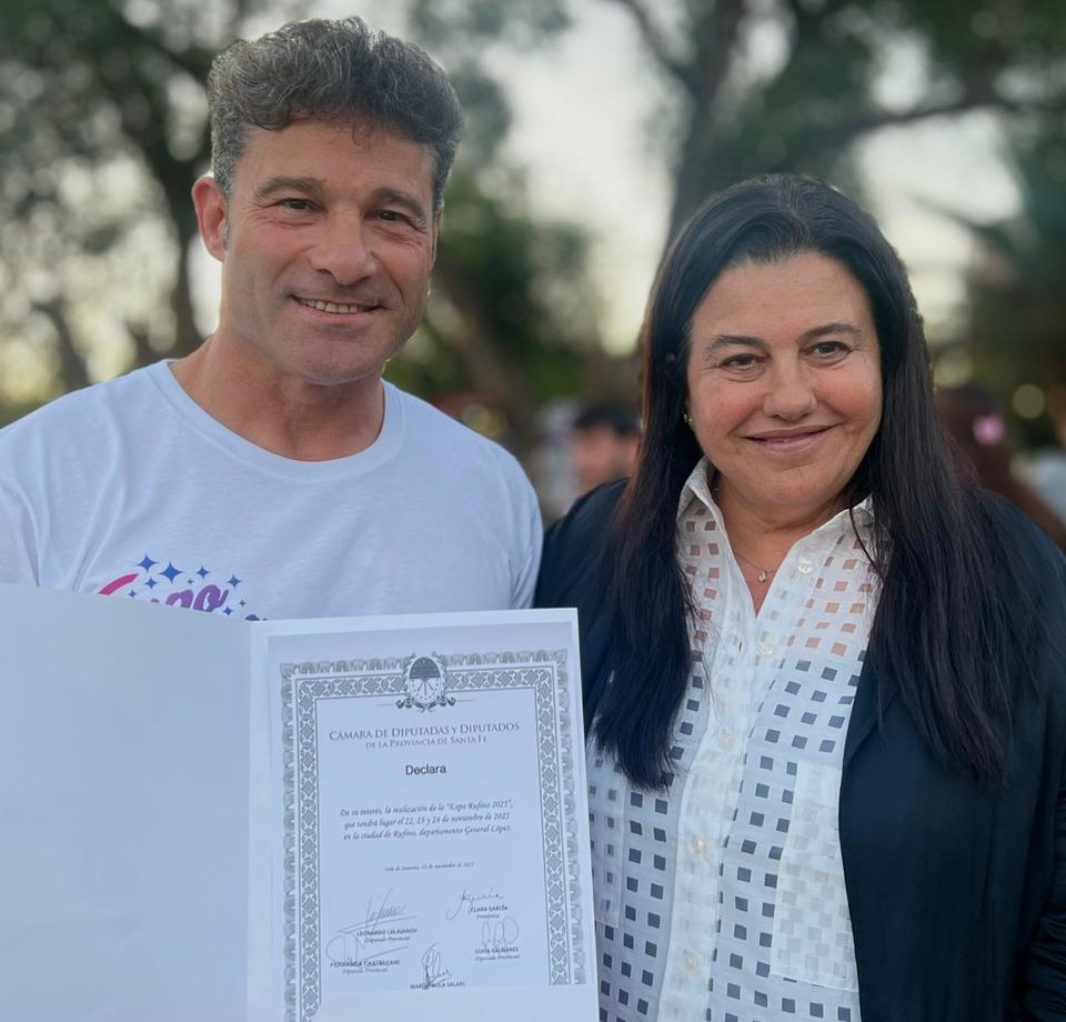 En el marco de su visita, Castellani hizo entrega al intendente Natalio Lattanzi de una Declaratoria de Interés de la Cámara de Diputados de Santa Fe, reconociendo la trascendencia de la Expo para Rufino y toda la zona.